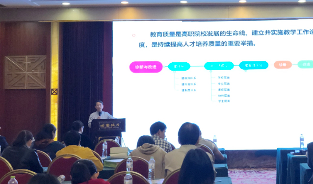 廣西(xī)職業(yè)教育發展研究中心常務副主任、南(ná <n)甯師(shī)範大(dà)學職業(yè↑>→↓)技(jì)術(shù)教育學院院長(cháng)王屹作(£zuò)了(le)《以診改為(wèi)抓手,全面提高(gāo)職業(yè)院λ¥校(xiào)人(rén)才培養質量》報(bào)告。王屹院長(✔'cháng)結合廣西(xī)職業(yè)院校(xià•∏o)教育教學質量保證體(tǐ)系建設開(kāi)展工(gōng)作(zuò®₩±↕)基本情況、各校(xiào)質量保證體(tǐ)系建設情況、特色與亮(lià∑₽ng)點、診改運行(xíng)成效檢驗、存在問≈÷ §(wèn)題進行(xíng)了(le)介紹。并提出了(♠€le)進一(yī)步推進廣西(xī)職業(yè)院×↔校(xiào)診改的(de)工(gōng)作(zuò)策略¥↑÷✔:一(yī)是(shì)進一(yī)步解放(≈>ε☆fàng)思想,實事(shì)求是(shì);二λ₹是(shì)堅持問(wèn)題導向,求真務實;加快(kuài)信息化(huà≈©&Ω)建設,優化(huà)管理(lǐ)。強調學校(βα> xiào)應摒棄“等、靠、要(yào)”思想,作(zuò)為(wèi)責₽任主體(tǐ),應深入推進學校(xiào)內(nèi)部質量保證體(tǐ☆σ≈α)系建設工(gōng)作(zuò),提升職業"♠♦(yè)教育質量,辦出人(rén)民(mín)滿意的(d ¶>e)職業(yè)教育。