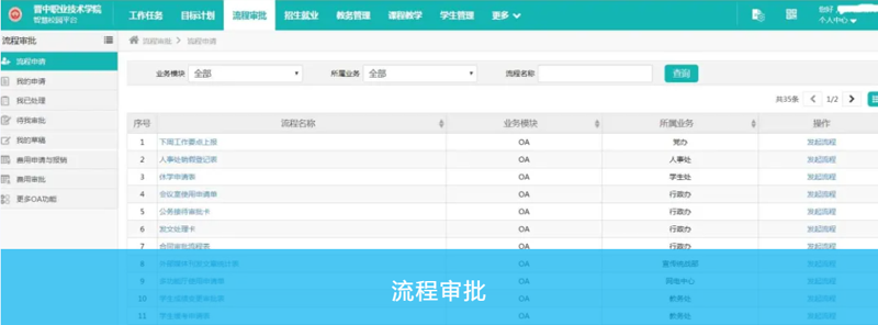 随著(zhe)信息化(huà)建設的(de)日(rì)益深入,部門(mén)₹∏<β間(jiān)的(de)信息溝通(tōng)與協同工(ε<gōng)作(zuò)越來(lái)越重要• δ(yào)。如(rú)果不(bù)同機(jī)構、上(shàng)下≥&(xià)級部門(mén)溝通(tōng)不(bù)σαλ暢容易導緻辦事(shì)效率低(dī),将會(huì)嚴重影(yǐn'γg)響學校(xiào)日(rì)常管理(lǐ)。♦對(duì)于學院各部門(mén)工(gōng)作(zuò)中存在的(de)π£一(yī)些(xiē)需要(yào)逐級審核審批的(de)事(s↔σ•<hì)務、多(duō)部門(mén)協同,如(rú)公×¥文(wén)流程辦理(lǐ)、教職工(gōng)請(qǐng)假、合同•γ ±審批、公務接待等,晉中職業(yè)技(j>®ì)術(shù)學院結合規章(zhāng)制(zhì)度、實際情況,将學€院過去(qù)一(yī)部分(fēn)通πφ(tōng)過紙(zhǐ)質簽字審批的(de)流程≠提取出來(lái),通(tōng)過表單流程協作(zuò),靈活定制(zhì☆®↔&)表單樣式及流程,實現(xiàn)了(le)學院無紙(zhǐ)化☆÷ "(huà)辦公,使得(de)各種審批手續變得(de∑÷&)簡單、快(kuài)捷、規範,方便提取曆史數(shù)據統計(jì)進行σ α∞(xíng)分(fēn)析。