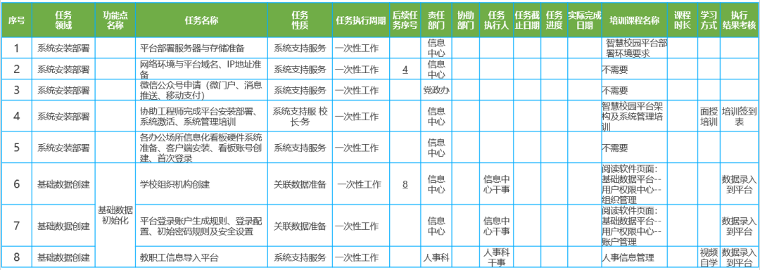 為(wèi)推動智慧校(xiào)園的(de)建設與應用(yòng),₹≤學校(xiào)應設計(jì)推進表,将智☆≥✔₹慧校(xiào)園平台推進涉及到(dào★)的(de)工(gōng)作(zuò)按₩π♥σ照(zhào)功能(néng)點進行(xíng)分(f☆ δēn)類,并将任務分(fēn)解并落實到(dào)具體(tǐ)部門(ménσ±♠)和(hé)責任人(rén),細化(huà)工(gōnσλg)作(zuò)目标,明(míng)确工(> ≈✘gōng)作(zuò)進度,落實工(gōng)作(zuò)責任,•✘有(yǒu)序推進智慧校(xiào)園建設及應用(yòng)↓±。基于這(zhè)樣一(yī)套智慧校(xiào)園開(kāi)局方法和(hé₽&>)對(duì)應培訓課程,确保學校(xiào)将智慧校(xiào)™¶ε園平台用(yòng)起來(lái)。