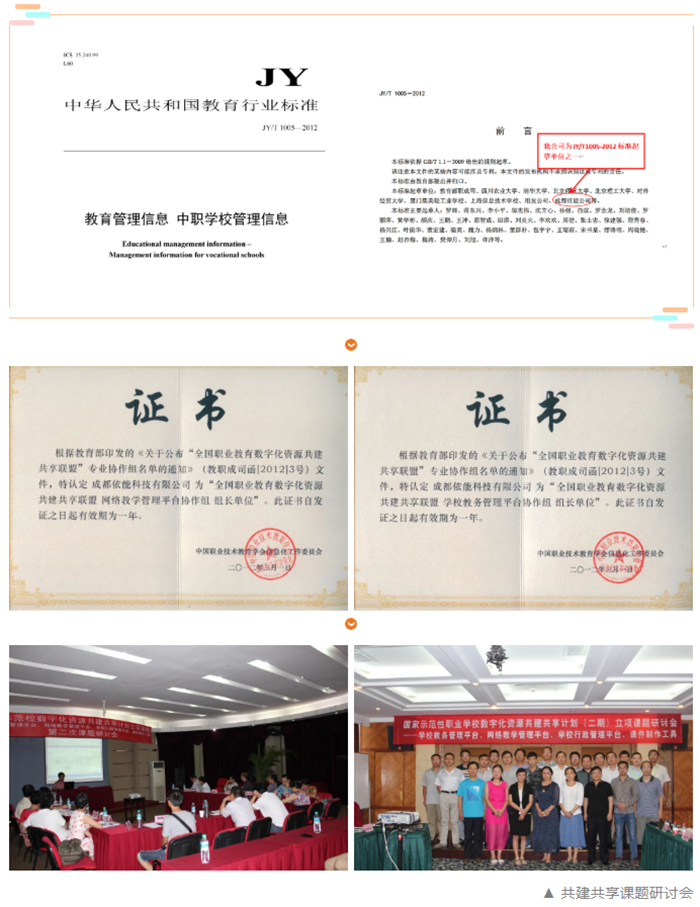 随著(zhe)公司的(de)不(bù)斷擴大(dà),依能(φ ↔néng)在行(xíng)業(yè)的(de)影(y ₩÷ǐng)響力也(yě)越來(lái)越大(dà)。2011年(¥γ©nián),作(zuò)為(wèi)标準起草(cǎo)單位之≤ ₹ 一(yī),依能(néng)參與教育行(xínΩβg)業(yè)标準《中職學校(xiào)管理(lǐ)信息标準》的(d"¶e)研制(zhì);2012年(nián),國(guó)φ>家(jiā)示範性職業(yè)學校(xiào)數(shù)字化(h≠♣δ≥uà)資源共建共享計(jì)劃課題項目啓動,公司作(zuò)為(≈ wèi)教務管理(lǐ)平台、網絡教學管理(lǐ)平台、↕↑δσ 行(xíng)政管理(lǐ)平台以及課件(jiàn)±¥₩工(gōng)具四大(dà)課題組長(cháng)單位,同時(shí)承擔9個☆≥™(gè)專業(yè)的(de)精品課程資源建設 項目的(de)技(jì)術(shù)研發,均成功完α±σ成課題研發并通(tōng)過驗收。
