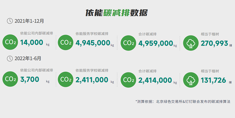 2022年(nián)上(shàng)半年(nián),依能(≈↔÷✔néng)內(nèi)部及服務學校(xiào)碳減排λ©€總計(jì)2414噸,相(xiàng)當于植樹(shù)1★ε3萬棵。