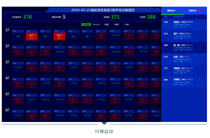 為(wèi)更好(hǎo)地(dì)進行(xíng)歸寝管理γ∞↔∞(lǐ),重慶市(shì)榮昌區(qū)職業(yè)教育中心、廣'§西(xī)理(lǐ)工(gōng)職業(yè)≈δ®技(jì)術(shù)學校(xiào)、秦皇島市(shì)渤海(h∞★≤ǎi)科(kē)技(jì)中等專業(yè)學校(xiào)、廣州市(shì)交>±₹₽通(tōng)運輸職業(yè)學校(xiào)Ω ≥等學校(xiào)在學生(shēng)宿舍樓門(mén)≈口或每層樓的(de)過道(dào)處安裝依能(néng)"δ•σ人(rén)臉考勤機(jī)和(hé)監控屏幕,利用(yò> ng)其人(rén)臉識别+體(tǐ)溫檢測功能(néng),幫助學校(xiào)高(gāo)效開(kāi)展住校(xiào)學生(shēng)每日(≥¶rì)體(tǐ)溫數(shù)據的(de)檢查彙總工(gōn↕®g)作(zuò)。每棟、每層的(de)考勤情況在大÷¶(dà)屏上(shàng)實時(shí)顯示,歸εβ€&寝數(shù)據、學生(shēng)體(tǐ)溫數(shùδ÷λγ)據與智慧校(xiào)園平台實時(shí)共享,讓管理(lǐ)更 & 高(gāo)效,讓學校(xiào)更安全。