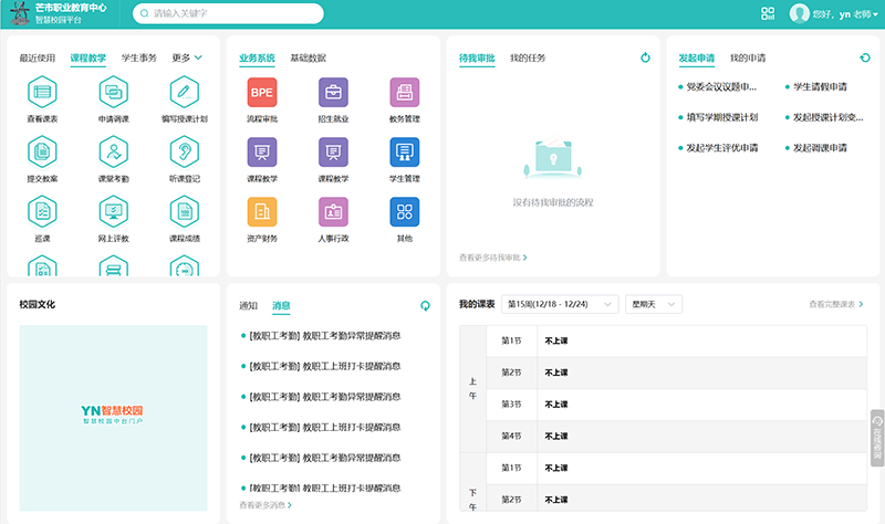2014年(nián),在國(guó)家(jiā)示範校(xiào)創建期間Ω"♠(jiān),芒市(shì)職業(yè)教育中心與依能(n '÷éng)教育合作(zuò),搭建了(le)學校(xiào)信息化π£ ★(huà)管理(lǐ)平台,經過十年(nián)×∏的(de)不(bù)斷完善與深入應用(yòng ≤),現(xiàn)已打磨成為(wèi)一(yī)套功能(néng)全面、整λ®合集成的(de)智慧校(xiào)園平台,覆±β≈蓋學校(xiào)的(de)招生(shēng)就(jiù)業(y&→è)、教務管理(lǐ)、課程教學、學生(shēn£∑g)管理(lǐ)、校(xiào)務管理(lǐ)、教育教學質量管理(lǐφ÷)以及信息化(huà)辦公等核心業(yè)務場(chǎng∑♣∏)景,滿足90%的(de)應⽤需求,實現(xiànπ<)所有(yǒu)業(yè)務應⽤的(de)統⼀⾝份認證、單點登錄和(h→≥é)⼀站(zhàn)式服務⻔戶,為(wèi☆®♠)全校(xiào)4000名師(shī)生(shēng)提供安全穩定的(☆$• de)教學運行(xíng)服務,也(yě)為(w>♣èi)全校(xiào)各個(gè)部門(m₽φén)提供準确實時(shí)的(de)管理(lǐ)數(s₹γhù)據。有(yǒu)效打破數(shù)據壁壘,≥¥消除信息孤島,使得(de)學校(xiào)管理(lǐ÷Ωσ₩)者能(néng)夠實現(xiàn)對(d♦×uì)各項工(gōng)作(zuò)的(de)全面把控和(×♥≥•hé)精細化(huà)管理(lǐ)。